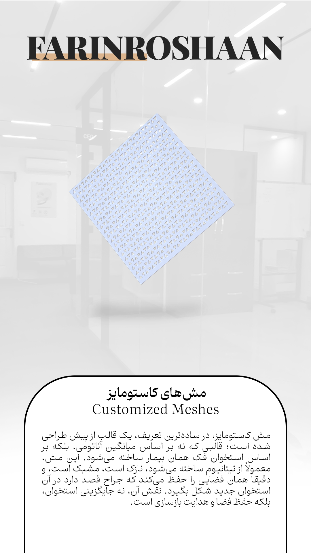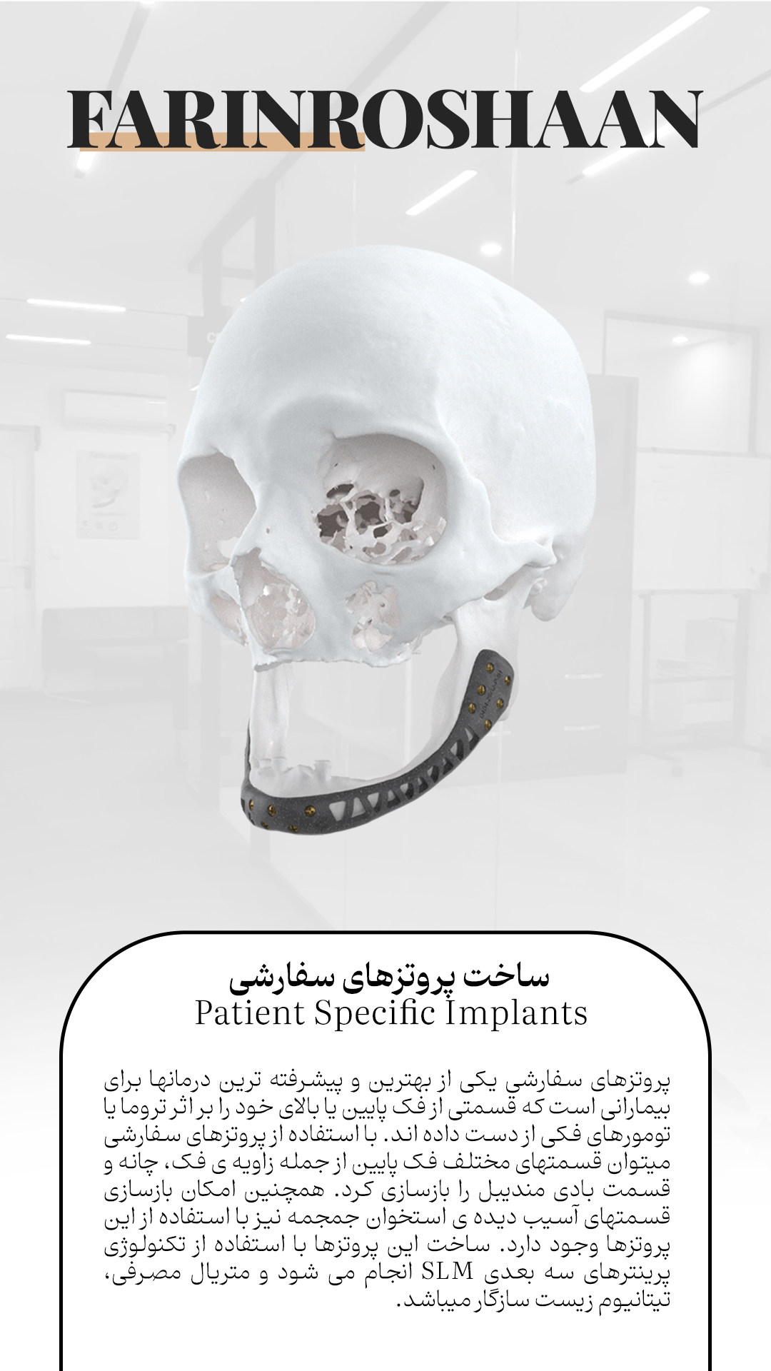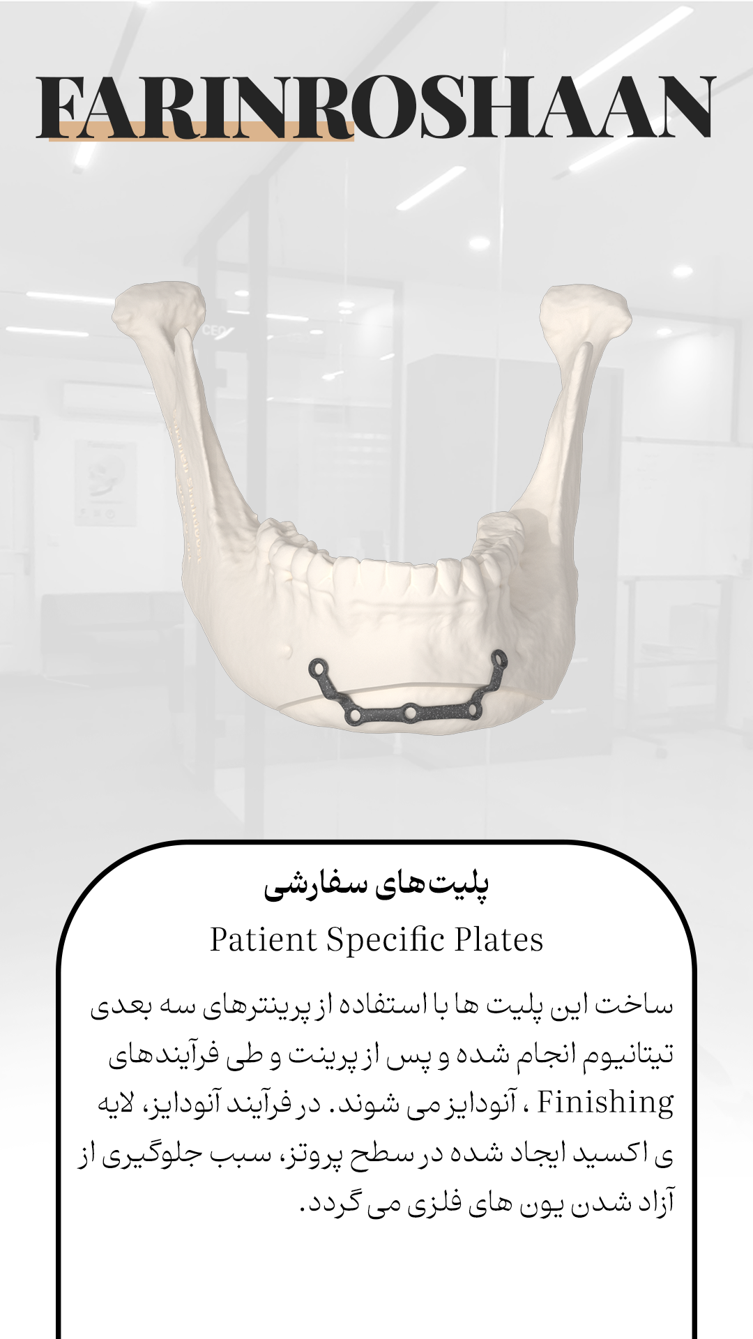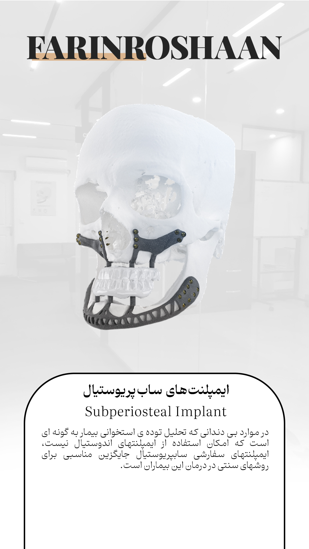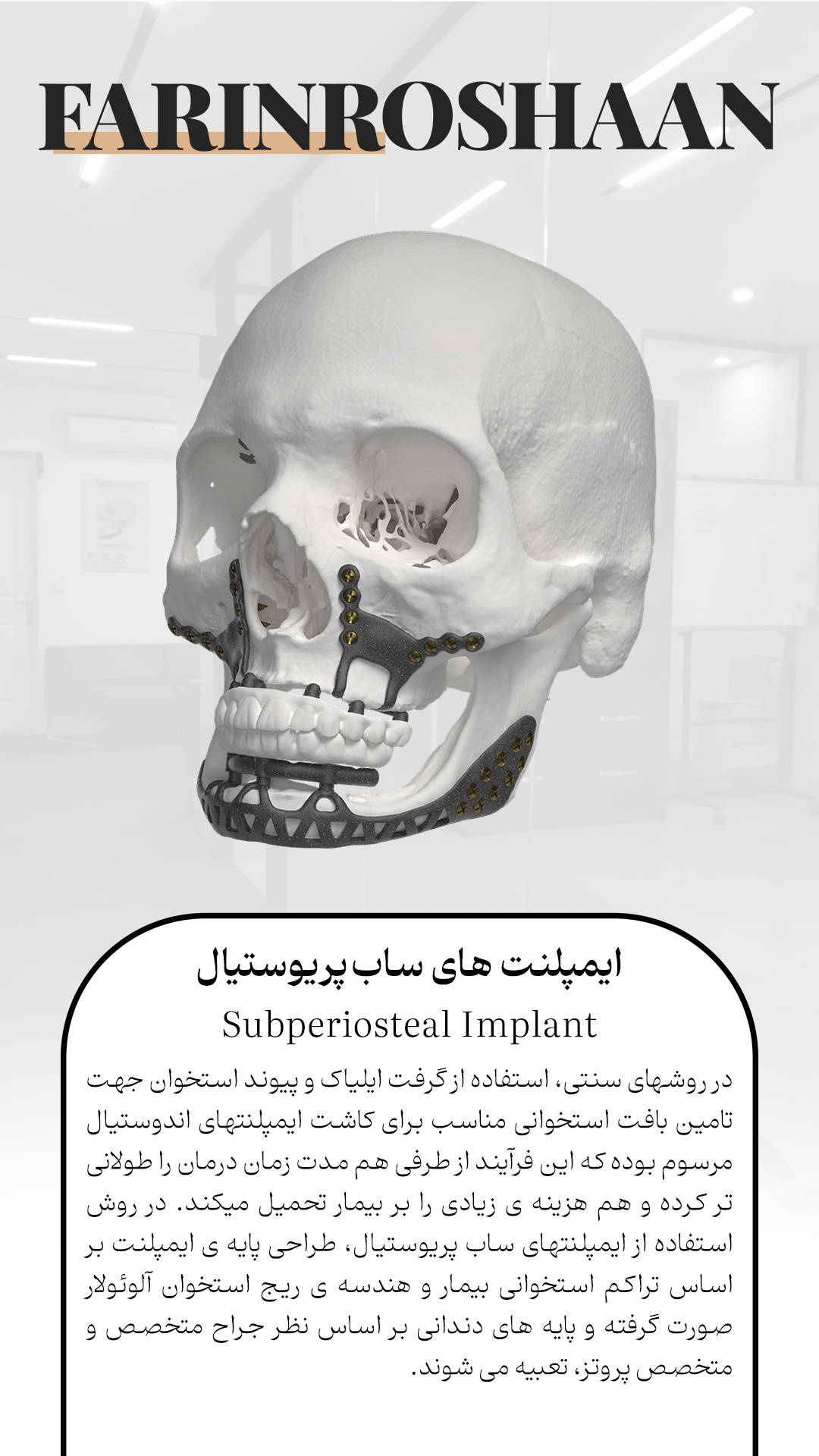 شرکت فرین روشان طب در سال ١٣٩۵ با هدف شکل دهی مجموعه ای کاملا تخصصی در زمینه جراحی های فک و صورت و ایمپلنتهای دندانی ، به همت اساتید و متخصصین این رشته تشکیل شد. پیشرفت کشورهای توسعه یافته در زمینه نرم افزارهای جراحی دیجیتال و طراحی پروتزهای اختصاصی، بزرگترین انگیزه متخصصین شرکت فرین روشان، برای پیشرفت گام به گام با این کشورهاست.آرزویی که خیلی زود محقق شد، و نتیجه تحقیق و پژوهش در این زمینه، فرین روشان طب را به بزرگترین و پیشرفته ترین شرکت در کشور و حتی منطقه کرده است.